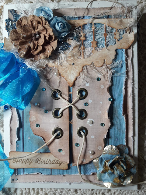 chyba nie ma piekniejszego polaczenia kolorow niz niebieski i braz, przynajmniej dla mnie. W tych odcieniach stworzylam urodzinowa karteczke. Babciny gorset ozdobiony kwiatami, gaza , wstazka, szkielkami, perelkami, nadaja jej retro klimatu. Kartke trobilam na wyzwanie na blogu Lemoncraft.